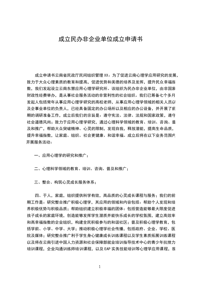 为了促进______________________________________________事业发展,我(们)发起设立___(单位名称)该组织为法人/合伙/个体,该组织为非国家财政性经费举办,从事社会服务活动的非营利性的社会组织,在以下业务范围内开展服务活动: