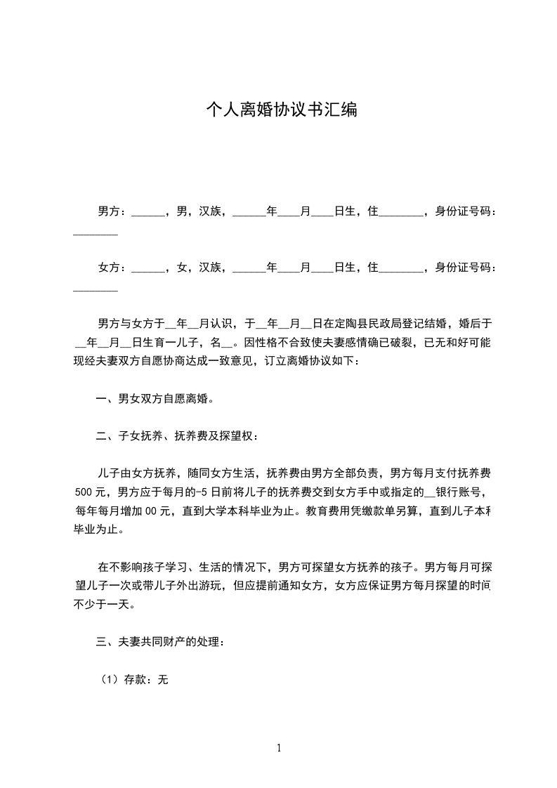 男方与女方于__年__月认识,于__年__月__日在定陶县民政局登记结婚,婚后于__年__月__日生育一儿子,名__。因性格不合致使夫妻感情确已破裂,已无和好可能,现经夫妻双方自愿协商达成一致意见,订立离婚协议如下: