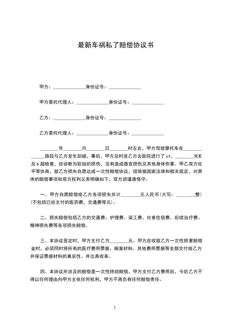 ________年________月________日________时左右,甲方驾驶摩托车在______________路段与乙方发生刮碰,事后,甲方及时送乙方去医院进行了ct,________光机及b超检查,经诊断为软组织损伤,没有造成器官损伤及其他身体伤害。甲乙双方经平等协商,就乙方损失自愿达成一次性赔偿协议,现依据国家法律和相关规定,对具体的赔偿事项和双方权利义务明确如下,双方须谨遵恪守:
