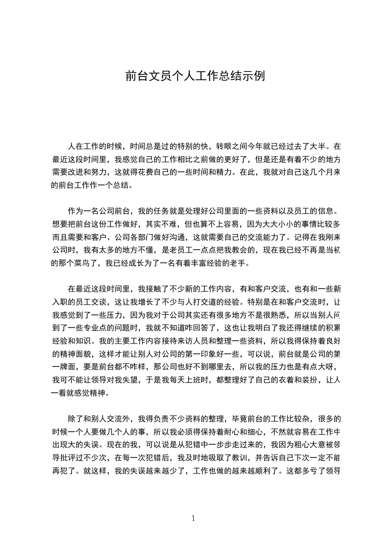 除了和别人交流外,我得负责不少资料的整理,毕竟前台的工作比较杂,很多的时候一个人要做几个人的事,所以我必须得保持着耐心和细心,不然就容易在工作中出现大的失误。现在的我,可以说是从犯错中一步步走过来的,我因为粗心大意被领导批评过不少次,在每一次犯错后,我及时地吸取了教训,并告诉自己下次一定不能再犯了。就这样,我的失误越来越少了,工作也做的越来越顺利了。这都多亏了领导和同事对我的耐心指导和帮助,要是没有他们,我也没法成长的这么快。相信在接下来的日子里,我能改正自己的缺点和不足,把前台工作做的更到位!
