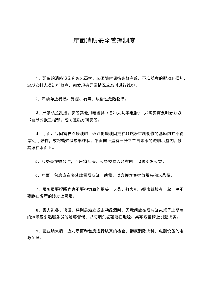 9、营业结束后,应对厅面和包房进行认真的检查,彻底消除火种,电器设备的电源关掉。