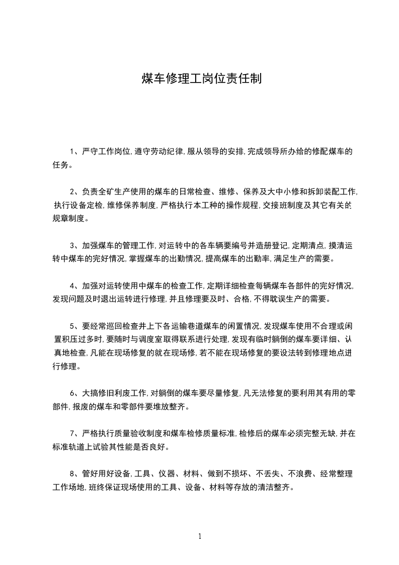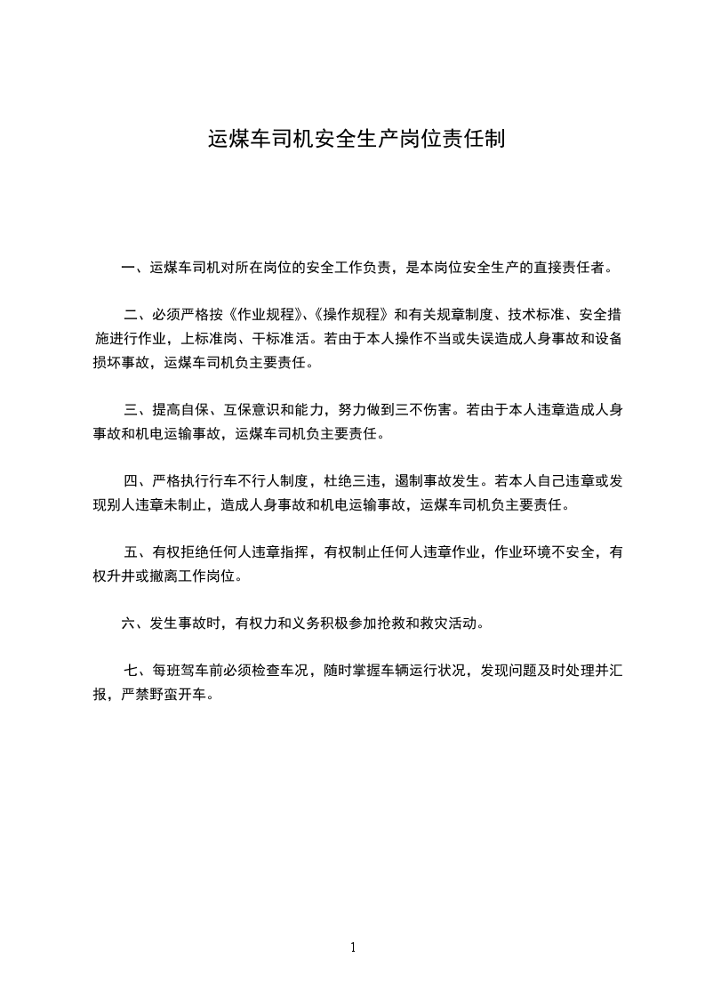 一、运煤车司机对所在岗位的安全工作负责,是本岗位安全生产的直接责任者。
