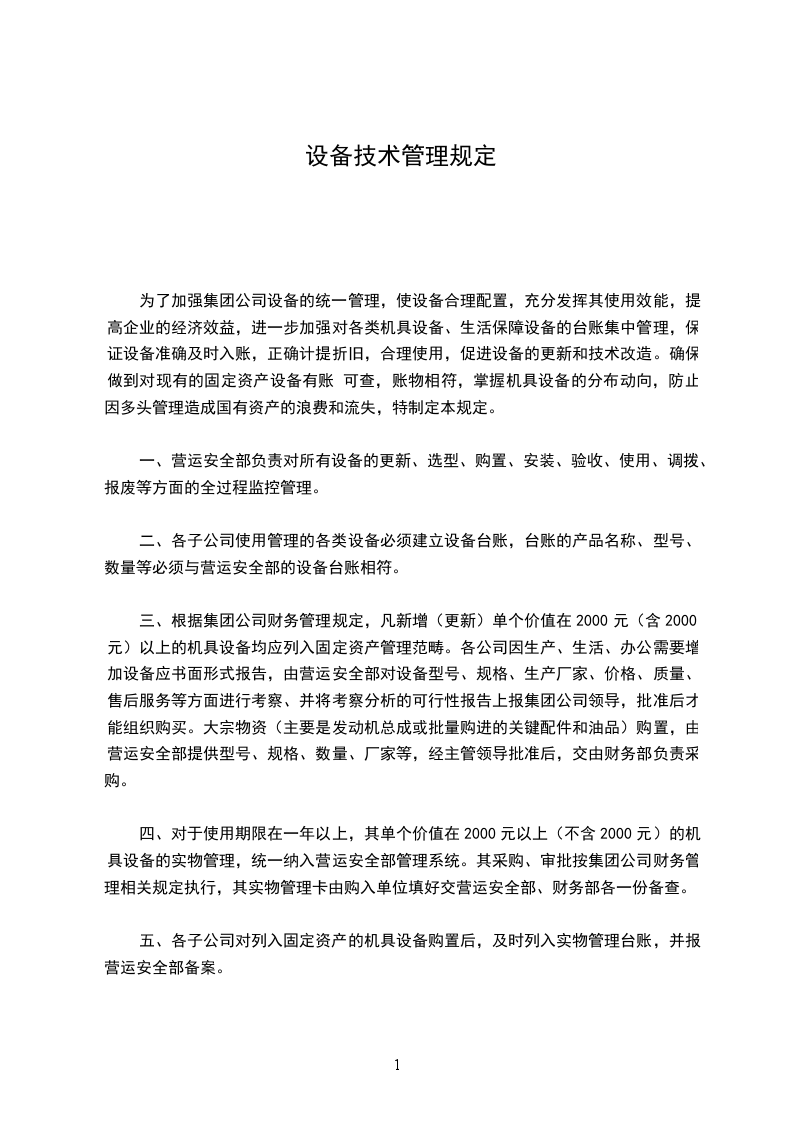 为了加强集团公司设备的统一管理,使设备合理配置,充分发挥其使用效能,提高企业的经济效益,进一步加强对各类机具设备、生活保障设备的台账集中管理,保证设备准确及时入账,正确计提折旧,合理使用,促进设备的更新和技术改造。确保做到对现有的固定资产设备有账 可查,账物相符,掌握机具设备的分布动向,防止因多头管理造成国有资产的浪费和流失,特制定本规定。