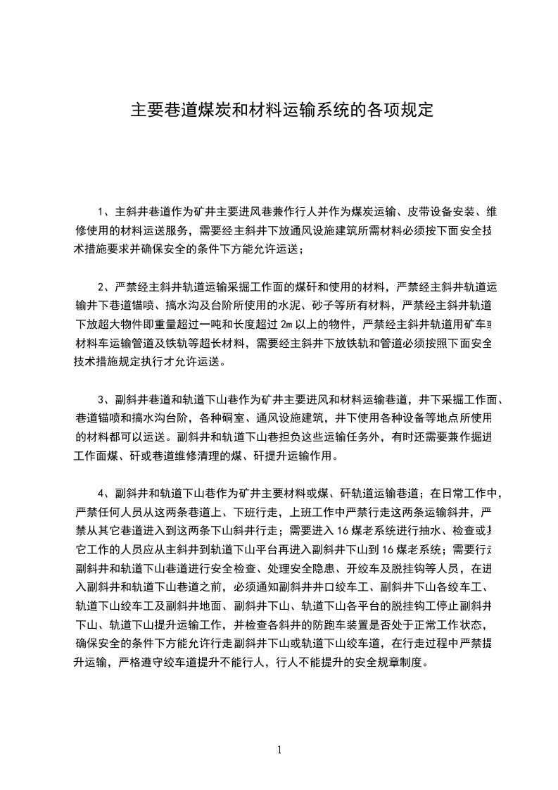 2、严禁经主斜井轨道运输采掘工作面的煤矸和使用的材料,严禁经主斜井轨道运输井下巷道锚喷、搞水沟及台阶所使用的水泥、砂子等所有材料,严禁经主斜井轨道下放超大物件即重量超过一吨和长度超过2m以上的物件,严禁经主斜井轨道用矿车或材料车运输管道及铁轨等超长材料,需要经主斜井下放铁轨和管道必须按照下面安全技术措施规定执行才允许运送。