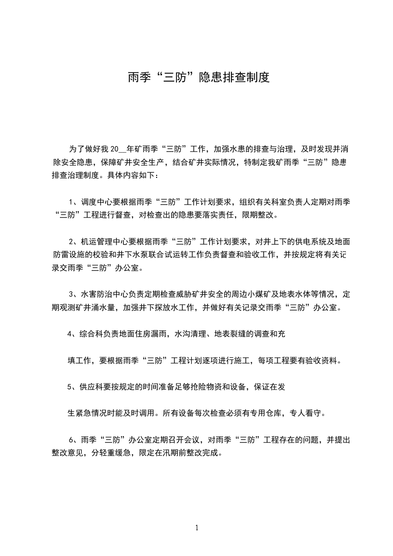 为了做好我20__年矿雨季“三防”工作,加强水患的排查与治理,及时发现并消除安全隐患,保障矿井安全生产,结合矿井实际情况,特制定我矿雨季“三防”隐患排查治理制度。具体内容如下: