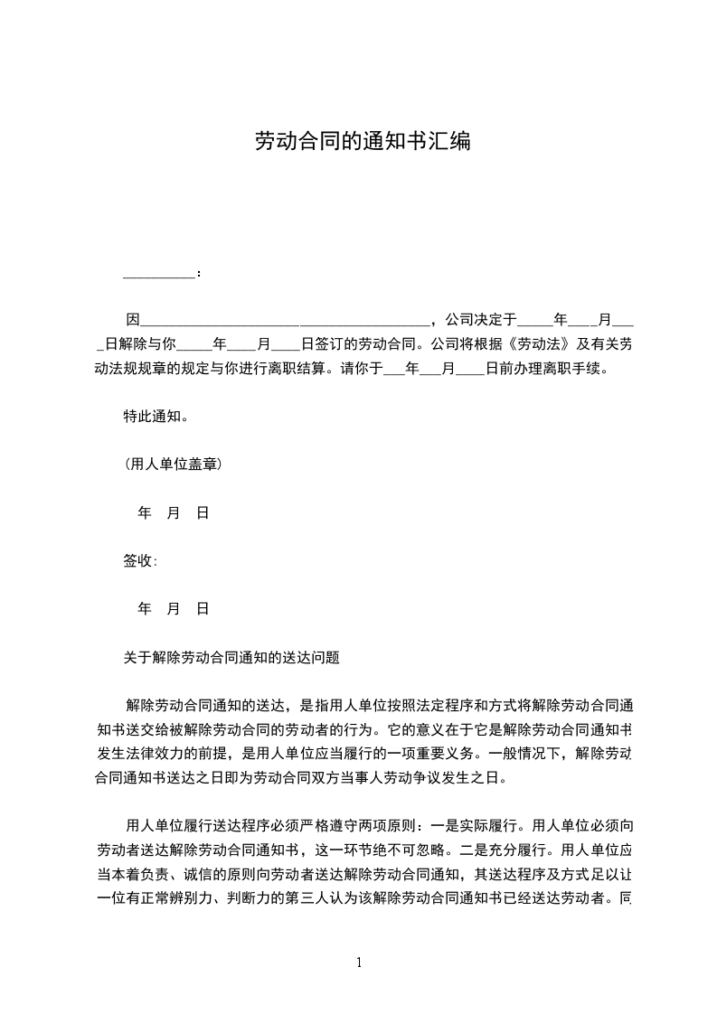 因________________________________________,公司决定于_____年____月____日解除与你_____年____月____日签订的劳动合同。公司将根据《劳动法》及有关劳动法规规章的规定与你进行离职结算。请你于___年___月____日前办理离职手续。