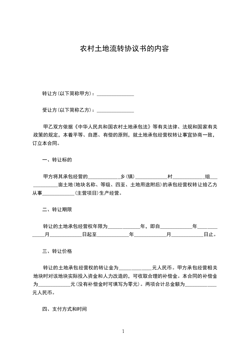 一、承包___________________土地面积共为_____________亩,四至界限为_________________、_________________、_________________、_________________。