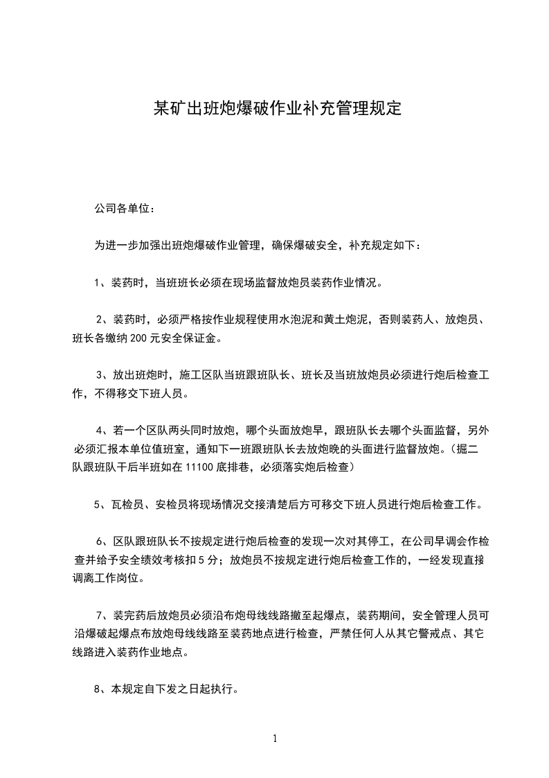 为进一步加强出班炮爆破作业管理,确保爆破安全,补充规定如下: