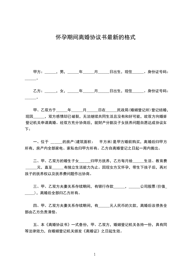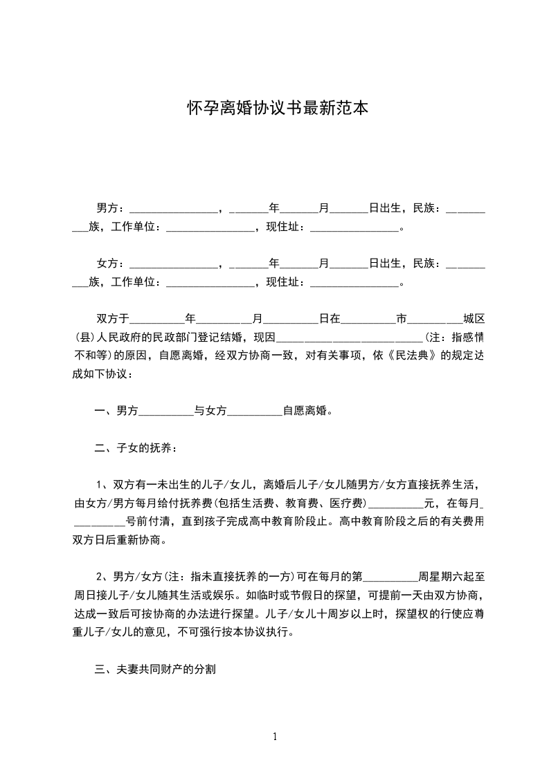 1、双方有一未出生的儿子/女儿,离婚后儿子/女儿随男方/女方直接抚养生活,由女方/男方每月给付抚养费(包括生活费、教育费、医疗费)__________元,在每月__________号前付清,直到孩子完成高中教育阶段止。高中教育阶段之后的有关费用双方日后重新协商。
