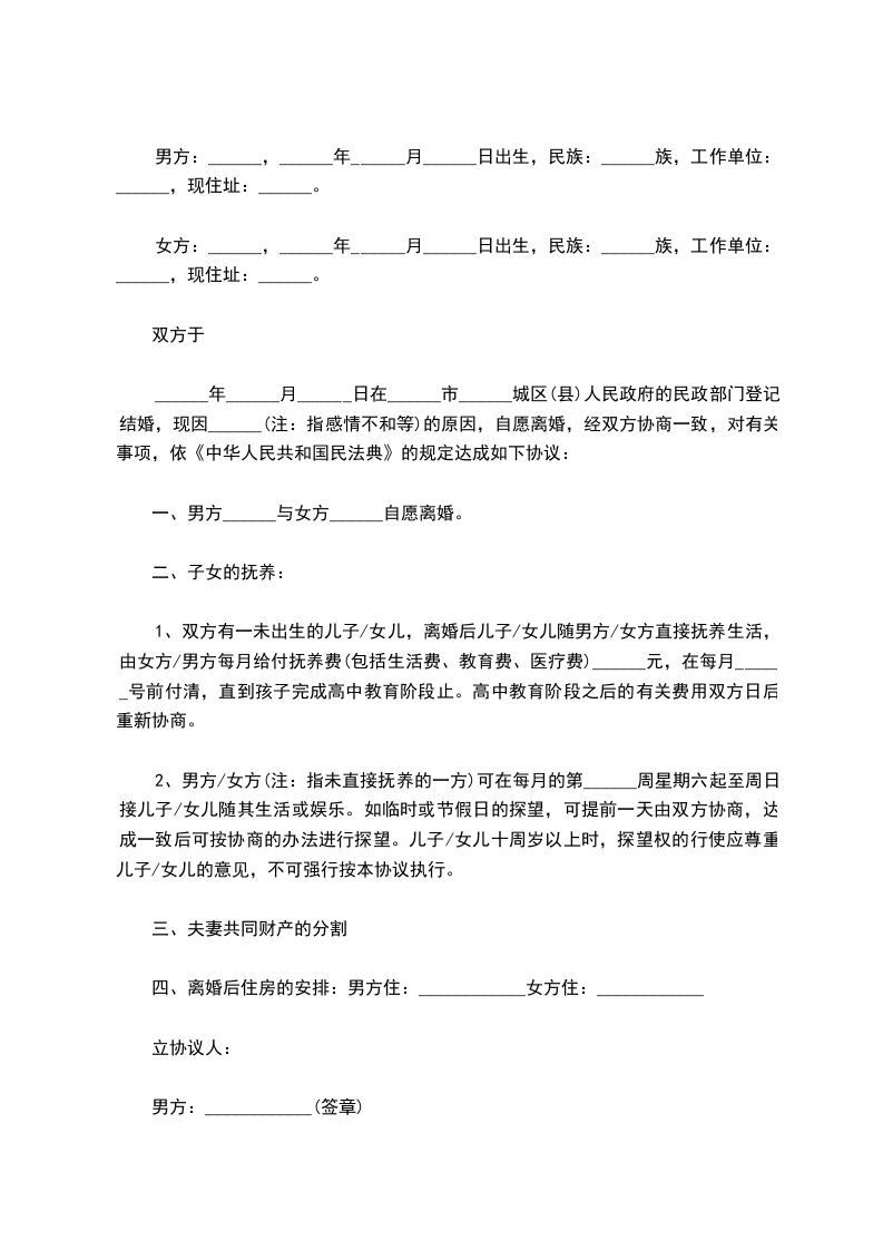 双方于__________年__________月__________日在__________市__________城区(县)人民政府的民政部门登记结婚,现因__________________________(注:指感情不和等)的原因,自愿离婚,经双方协商一致,对有关事项,依《民法典》的规定达成如下协议: