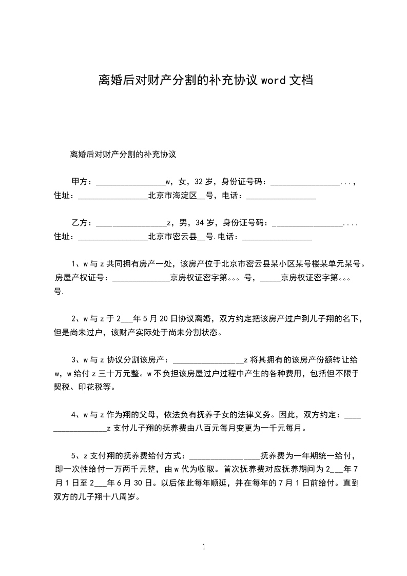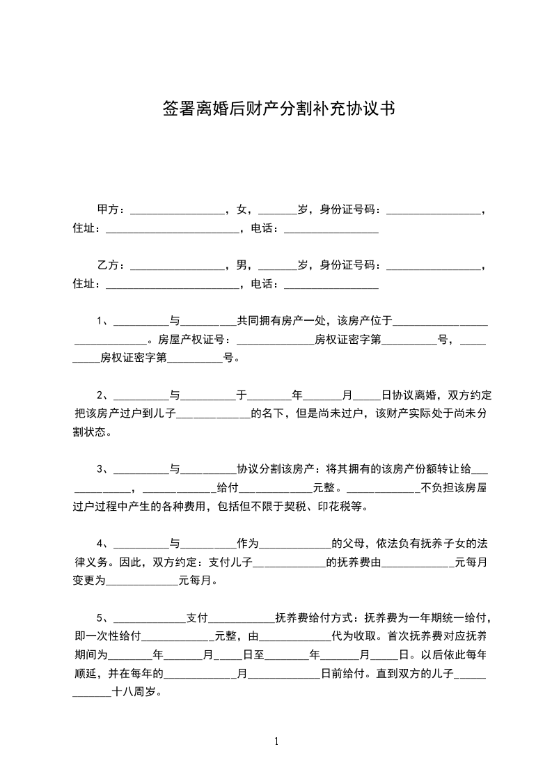 3、__________与__________协议分割该房产:将其拥有的该房产份额转让给_____________,_____________给付_____________元整。_____________不负担该房屋过户过程中产生的各种费用,包括但不限于契税、印花税等。