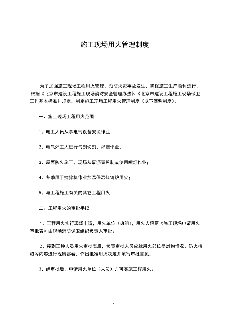 为了加强施工现场工程用火管理,预防火灾事故发生,确保施工生产顺利进行,根据《北京市建设工程施工现场消防安全管理办法》、《北京市建设工程施工现场保卫工作基本标准》规定,制定施工现场工程用火管理制度(以下简称制度)。