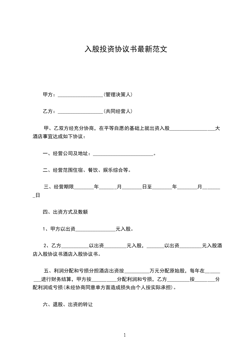 甲、乙双方经充分协商,在平等自愿的基础上就出资入股__________________大酒店事宜达成如下协议: