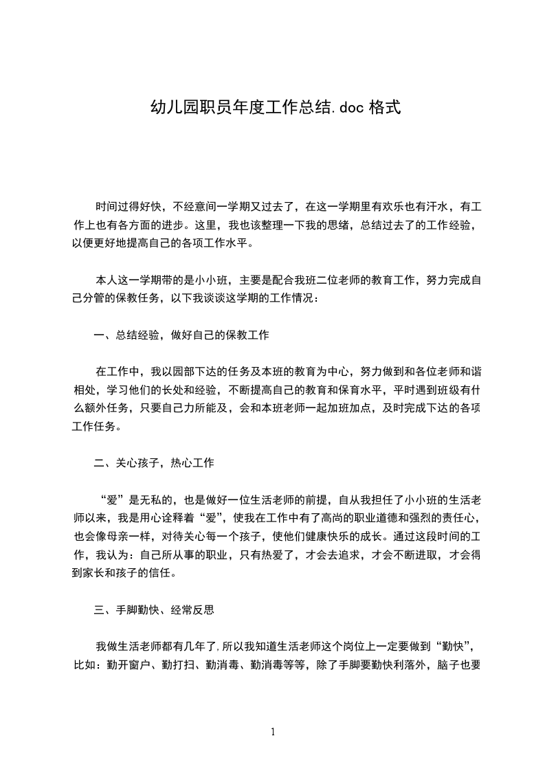本人这一学期带的是小小班,主要是配合我班二位老师的教育工作,努力完成自己分管的保教任务,以下我谈谈这学期的工作情况: