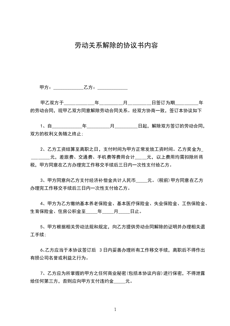 1、自_____________年__________月__________日起,解除双方签订的劳动合同,双方的权利义务随之终止;