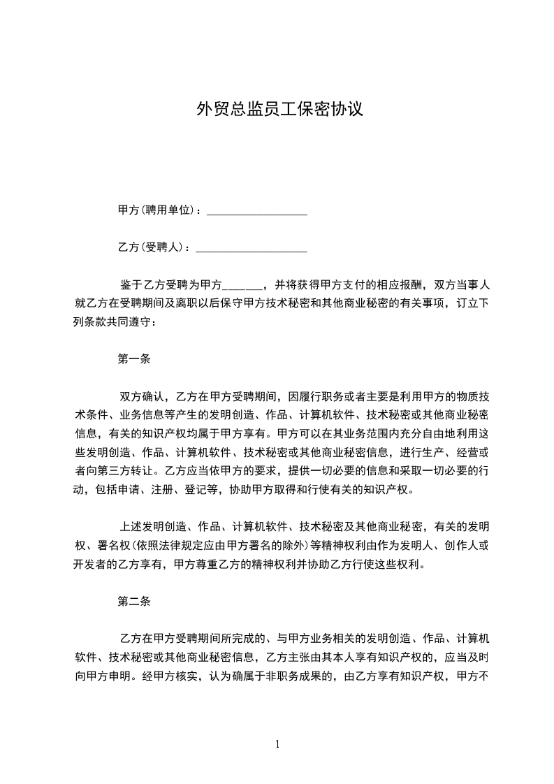 鉴于乙方受聘为甲方_______,并将获得甲方支付的相应报酬,双方当事人就乙方在受聘期间及离职以后保守甲方技术秘密和其他商业秘密的有关事项,订立下列条款共同遵守: