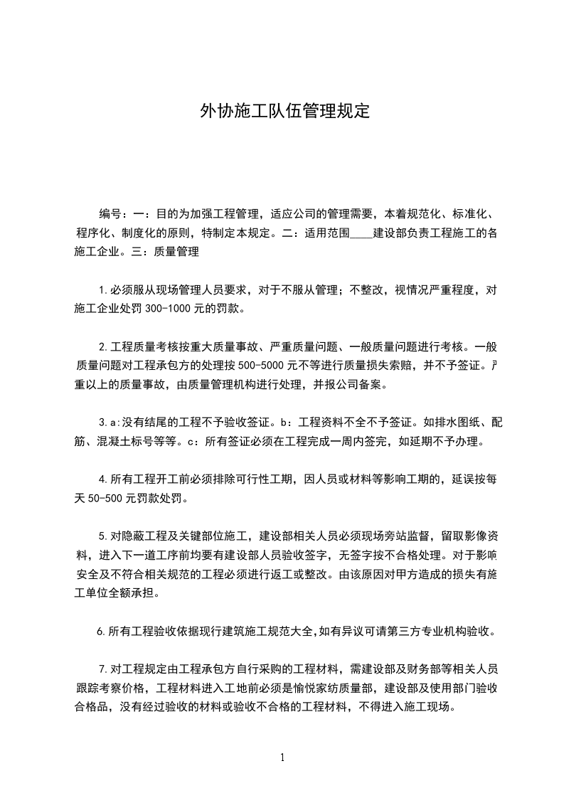 1、对具有独立法人地位并具备国家和行业规定的相应资质和从业条件的外包队承担部分工程施工后时(或虽没有上述条件,但经考核具有相应施工能力的纯劳务性服务组织),项目部与其签订外包合同(或劳务分包合同)时,必须签订《安全生产管理协议书》,明确安全管理的内容及承、发包双方各自的安全责任,并有明确的安全控制目标和具体安全措施、奖惩办法等。在外包合同签订后,外包队必须交纳安全保证金。
