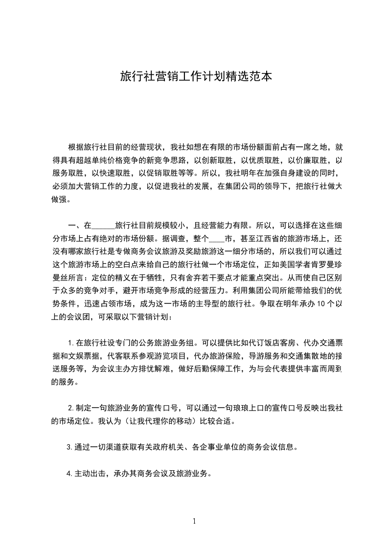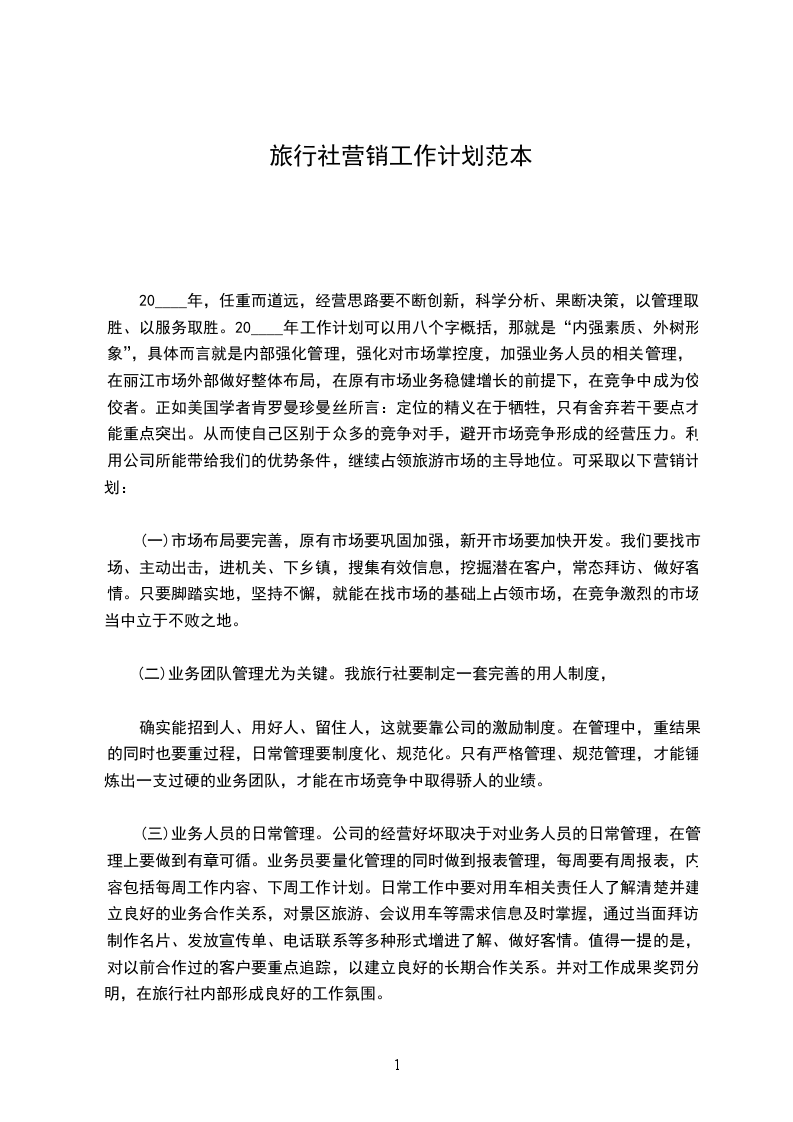 20____年,任重而道远,经营思路要不断创新,科学分析、果断决策,以管理取胜、以服务取胜。20____年工作计划可以用八个字概括,那就是“内强素质、外树形象”,具体而言就是内部强化管理,强化对市场掌控度,加强业务人员的相关管理,在丽江市场外部做好整体布局,在原有市场业务稳健增长的前提下,在竞争中成为佼佼者。正如美国学者肯罗曼珍曼丝所言:定位的精义在于牺牲,只有舍弃若干要点才能重点突出。从而使自己区别于众多的竞争对手,避开市场竞争形成的经营压力。利用公司所能带给我们的优势条件,继续占领旅游市场的主导地位。可采取以下营销计划: