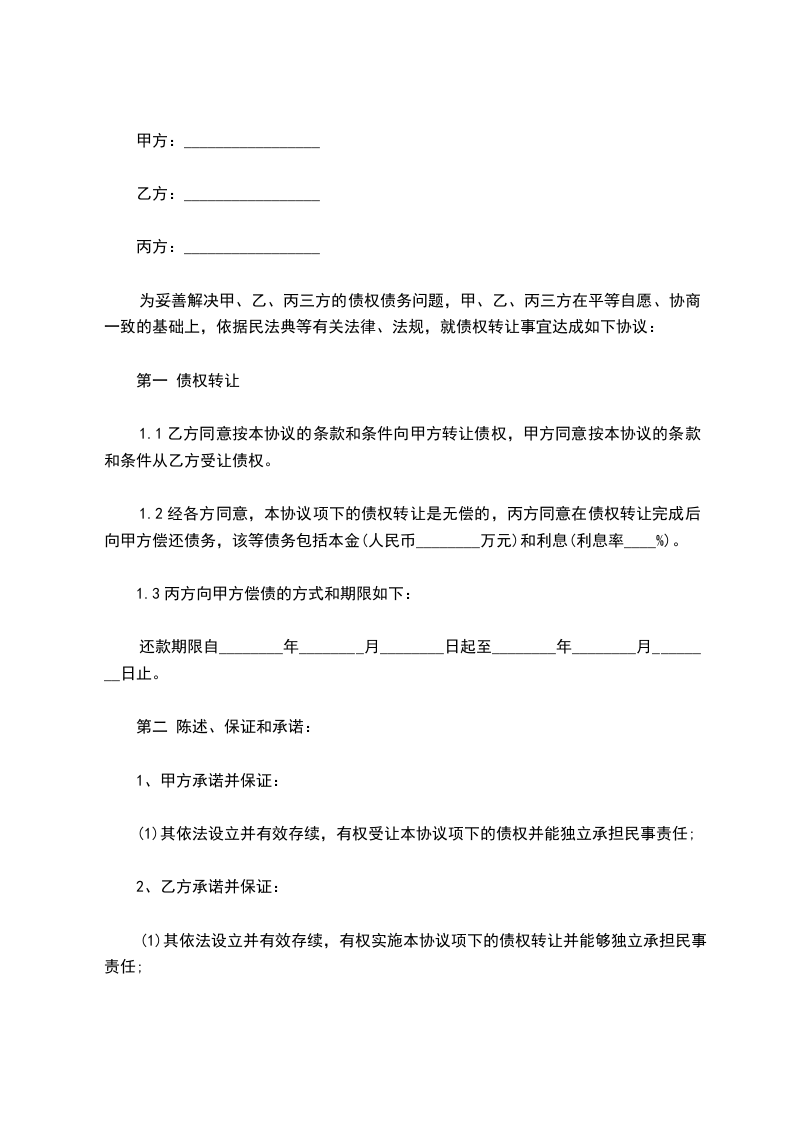 1.2经各方同意,本协议项下的债权转让是无偿的,丙方同意在债权转让完成后向甲方偿还债务,该等债务包括本金(人民币________万元)和利息(利息率____%)。
