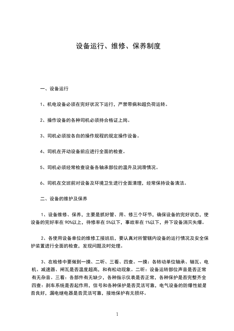 一、认真执行设备使用与维护相结合和设备谁使用谁维护的原则。单人使用的设备实行专责制。主要设备实行包机制(包运转、包维护、包检修)。设备使用实行定人、定机,凭证操作。主要管、线缆装置,实行区域负责制,分片包干的管理办法