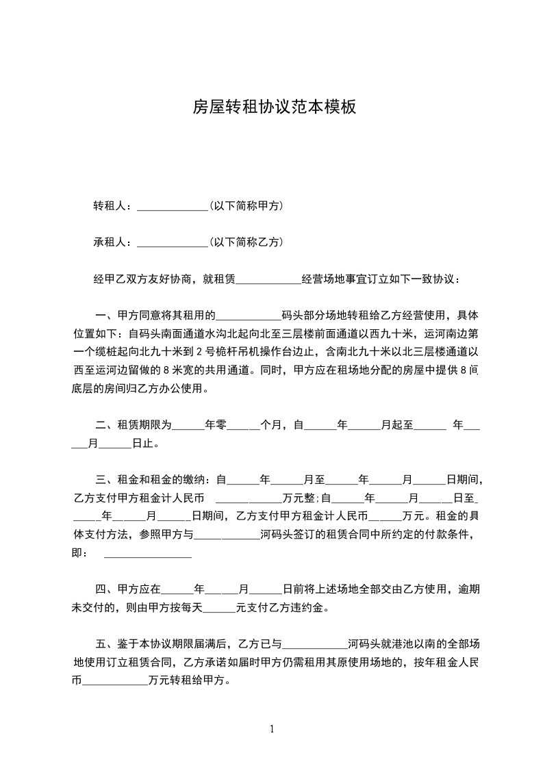 五、鉴于本协议期限届满后,乙方已与____________河码头就港池以南的全部场地使用订立租赁合同,乙方承诺如届时甲方仍需租用其原使用场地的,按年租金人民币____________万元转租给甲方。