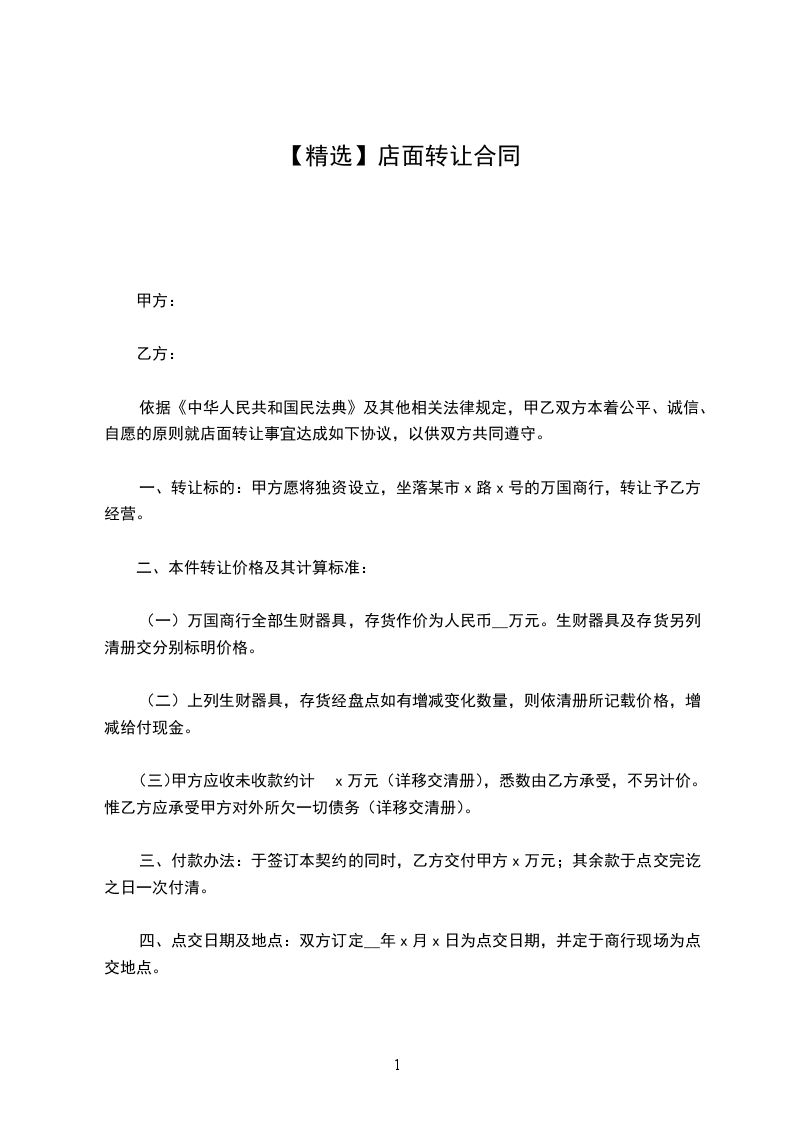 依据《中华人民共和国民法典》及其他相关法律规定,甲乙双方本着公平、诚信、自愿的原则就店面转让事宜达成如下协议,以供双方共同遵守。