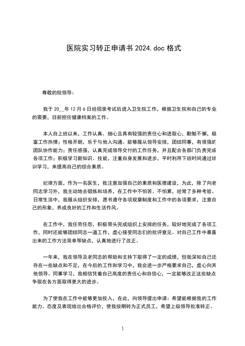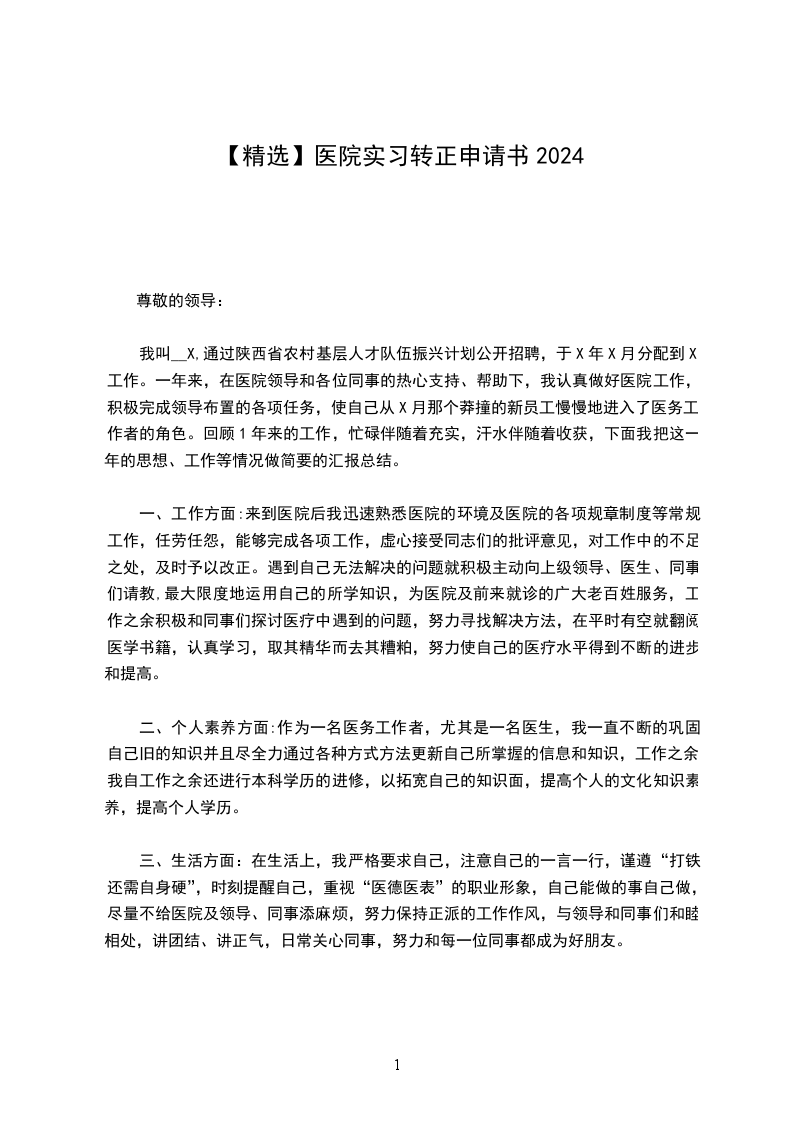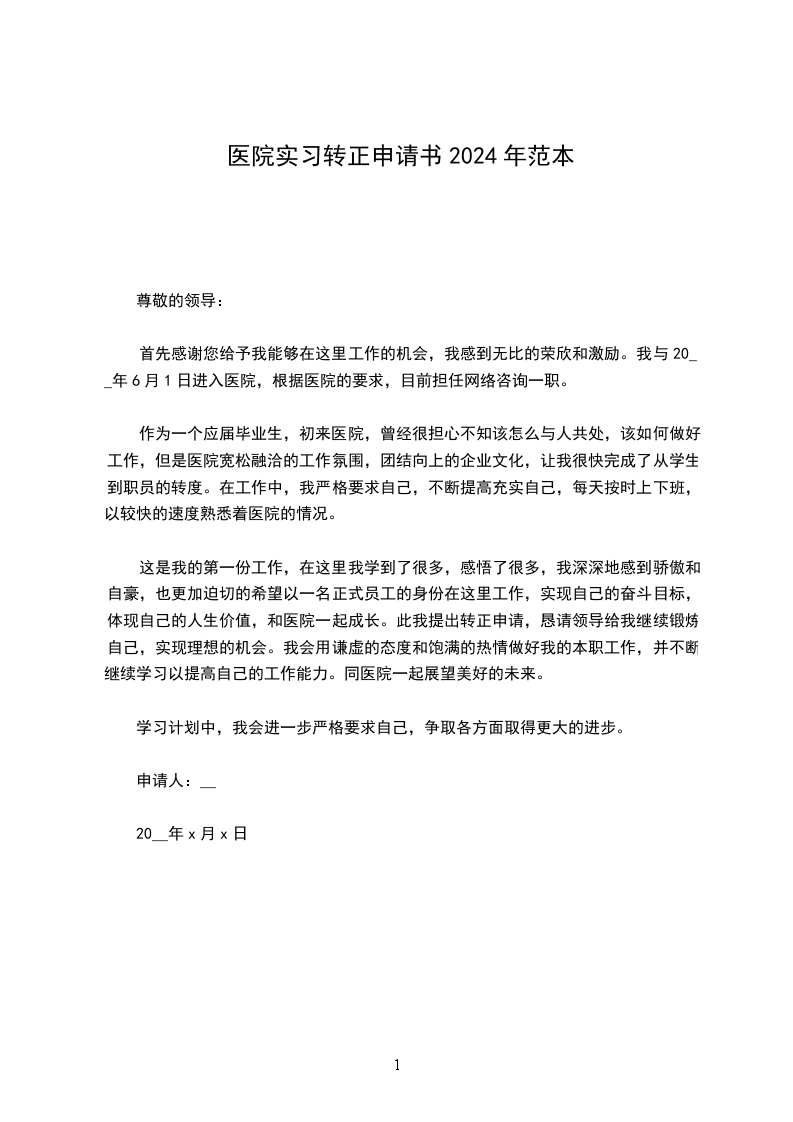我于__X年__月__日成为__X医院的试用员工,到今天__月试用期已满,根据单位的规章制度,现申请转为__X医院的正式员工。