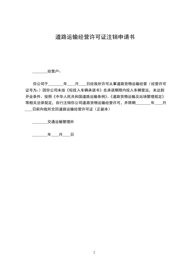 你公司于________年____月____日经我所许可从事道路货物运输经营(经营许可证号为:)因你公司未按《拟投入车辆承诺书》在承诺期限内投入车辆营运,未达到开业条件。按照《中华人民共和国道路运输条例》、《道路货物运输及站场管理规定》等相关法律规定,自行注销你公司道路货物运输经营许可,并限期________年____月____日前向我所交回道路运输经营许可证(正副本)