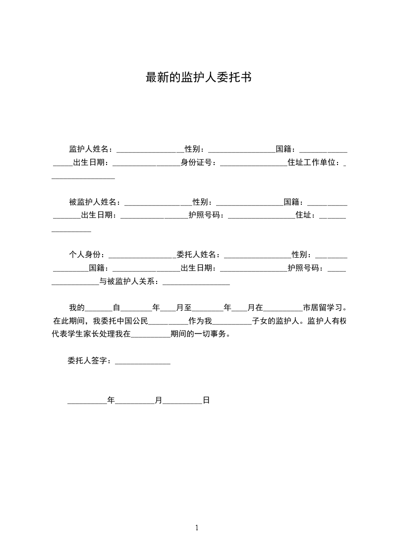 监护人姓名:_________________性别:_________________国籍:_________________出生日期:_________________身份证号:_________________住址工作单位:_________________