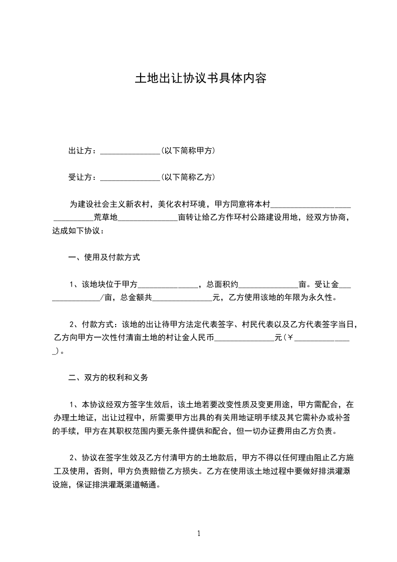 为建设社会主义新农村,美化农村环境,甲方同意将本村______________________________荒草地_______________亩转让给乙方作环村公路建设用地,经双方协商,达成如下协议: