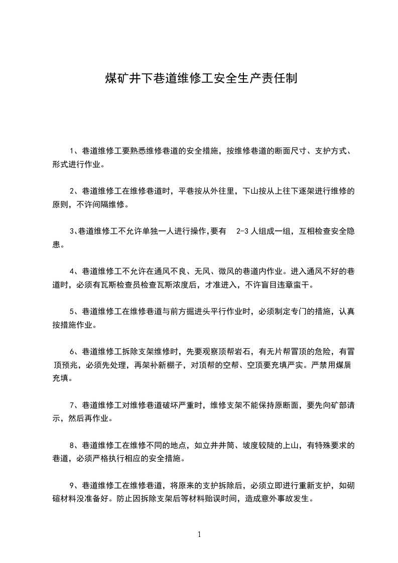 3、巷道维修工不允许单独一人进行操作,要有2-3人组成一组,互相检查安全隐患。
