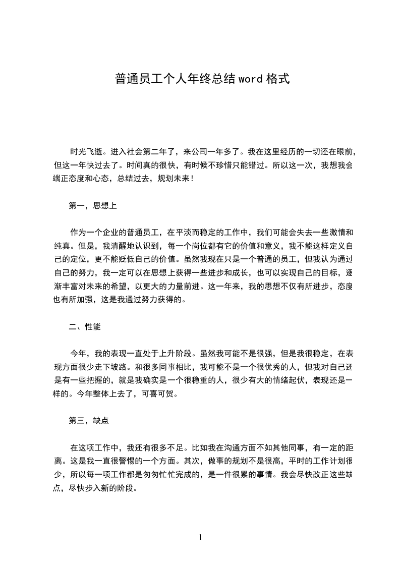 作为一个企业的普通员工,在平淡而稳定的工作中,我们可能会失去一些激情和纯真。但是,我清醒地认识到,每一个岗位都有它的价值和意义,我不能这样定义自己的定位,更不能贬低自己的价值。虽然我现在只是一个普通的员工,但我认为通过自己的努力,我一定可以在思想上获得一些进步和成长,也可以实现自己的目标,逐渐丰富对未来的希望,以更大的力量前进。这一年来,我的思想不仅有所进步,态度也有所加强,这是我通过努力获得的。