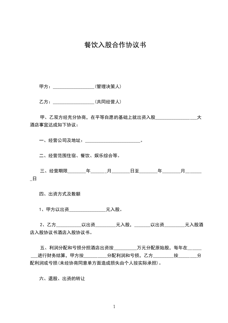 2、乙方___________以出资_________元入股,_______以出资_________元入股酒店入股协议书酒店入股协议书。