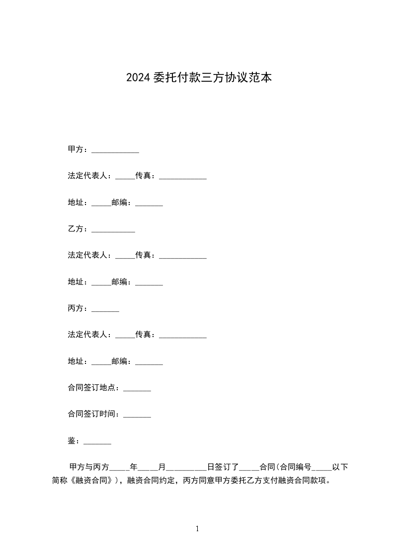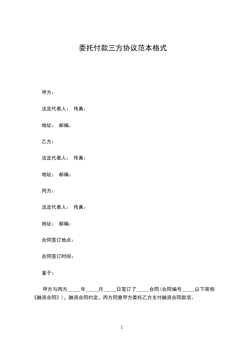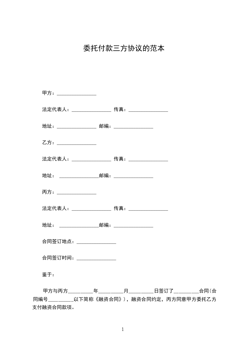 甲方与丙方__________年__________月__________日签订了__________合同(合同编号__________以下简称《融资合同》),融资合同约定,丙方同意甲方委托乙方支付融资合同款项。