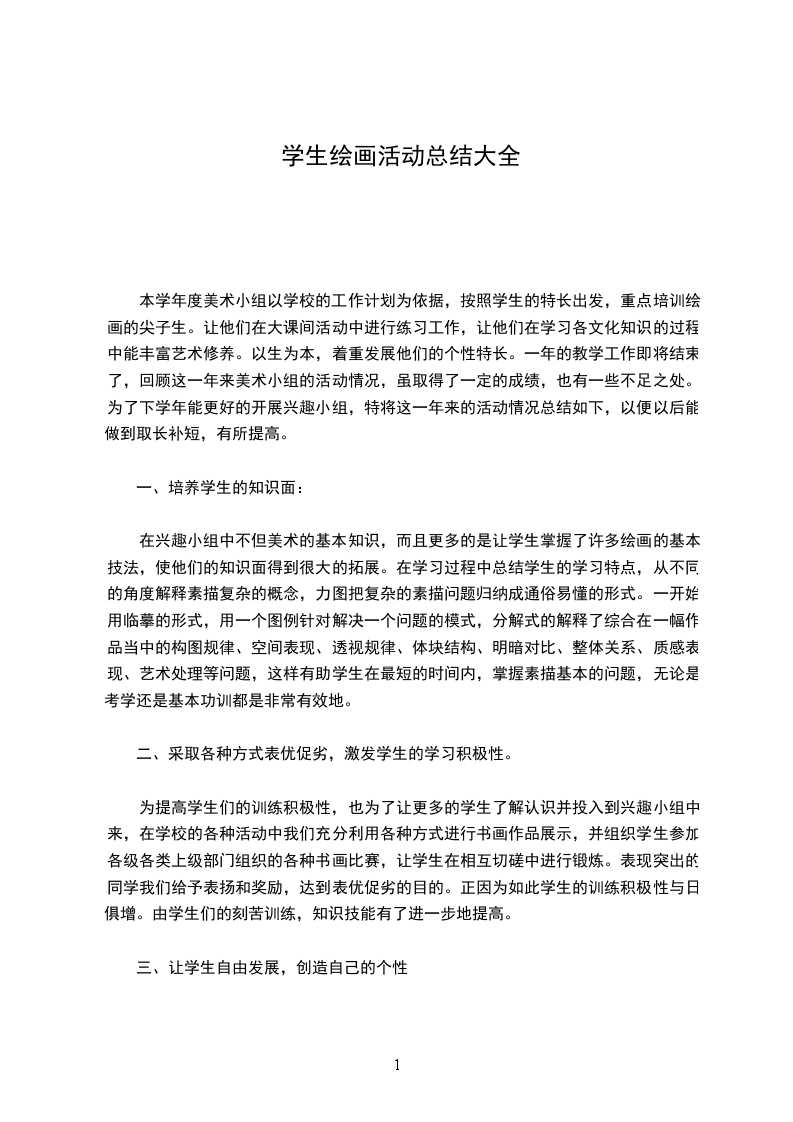 本学年度美术小组以学校的工作计划为依据,按照学生的特长出发,重点培训绘画的尖子生。让他们在大课间活动中进行练习工作,让他们在学习各文化知识的过程中能丰富艺术修养。以生为本,着重发展他们的个性特长。一年的教学工作即将结束了,回顾这一年来美术小组的活动情况,虽取得了一定的成绩,也有一些不足之处。为了下学年能更好的开展兴趣小组,特将这一年来的活动情况总结如下,以便以后能做到取长补短,有所提高。