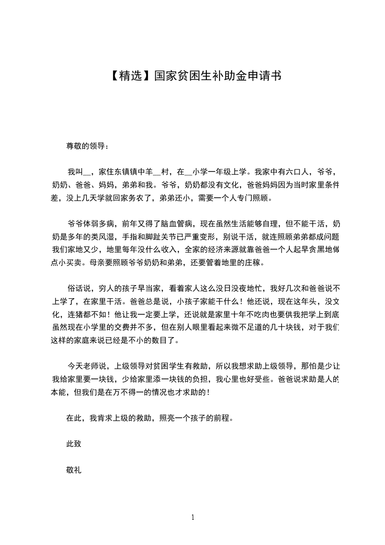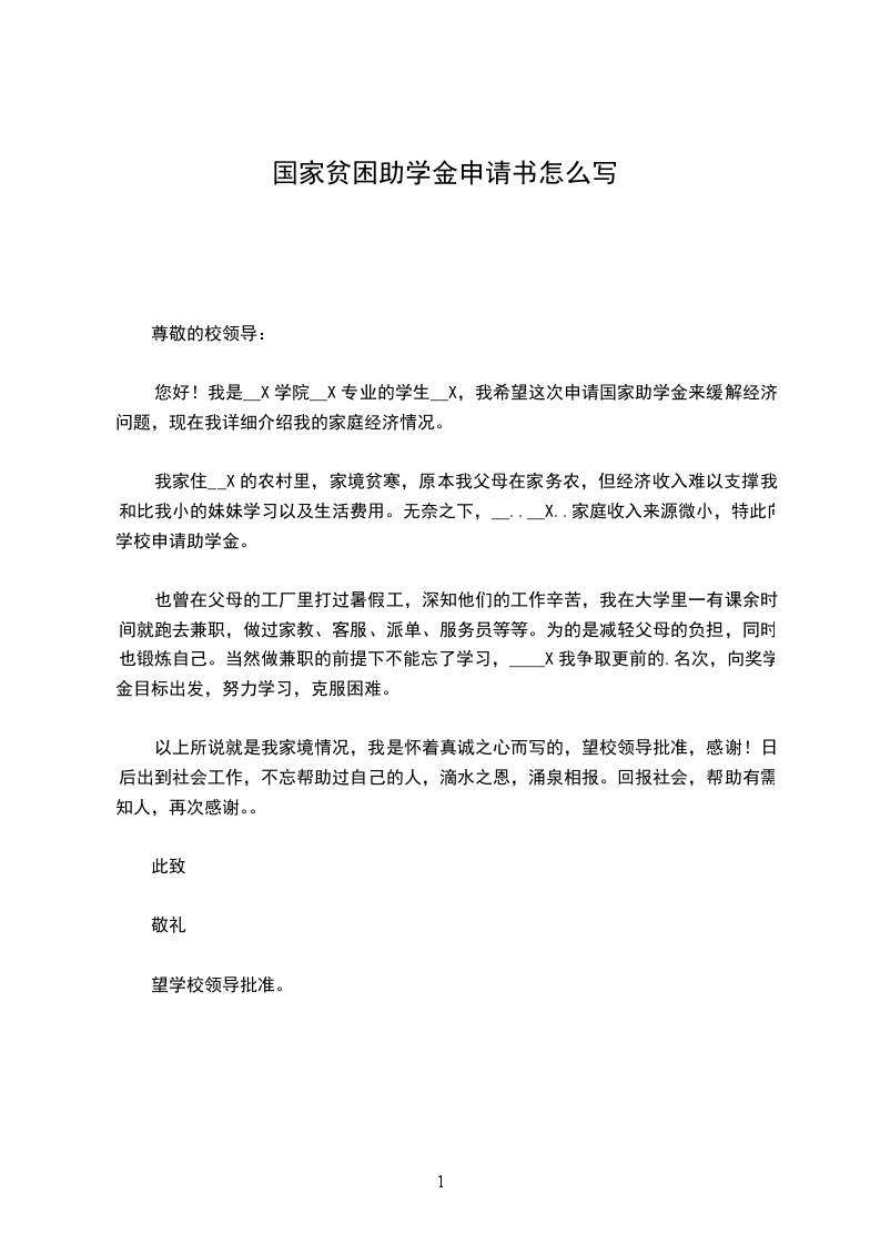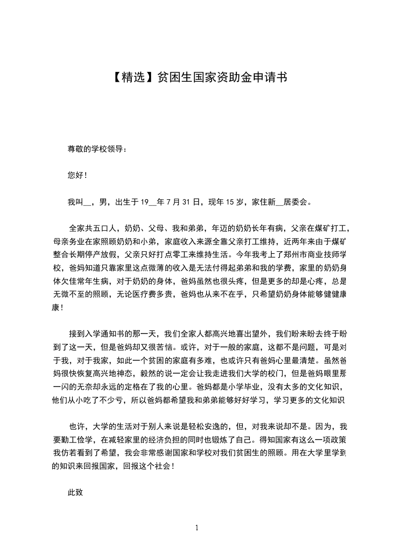 您好!我是__X学院__X专业的学生__X,我希望这次申请国家助学金来缓解经济问题,现在我详细介绍我的家庭经济情况。