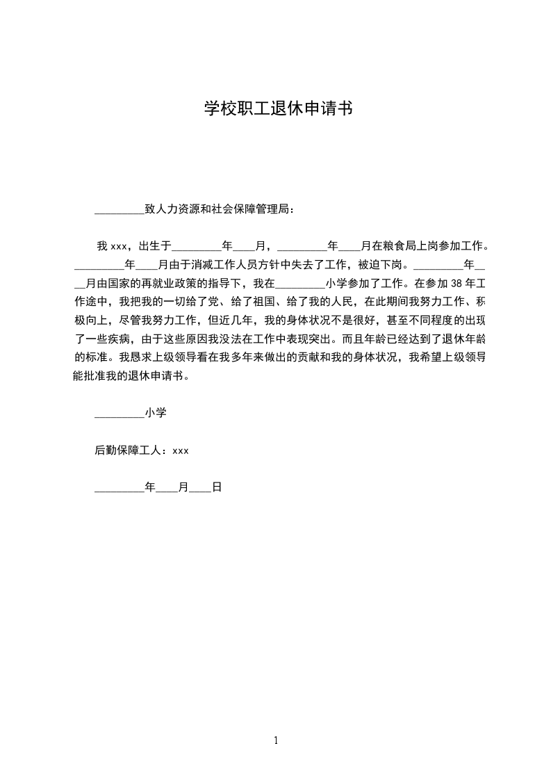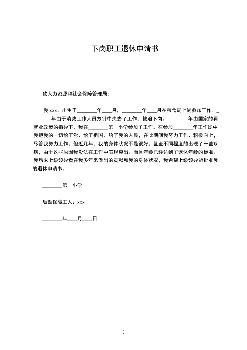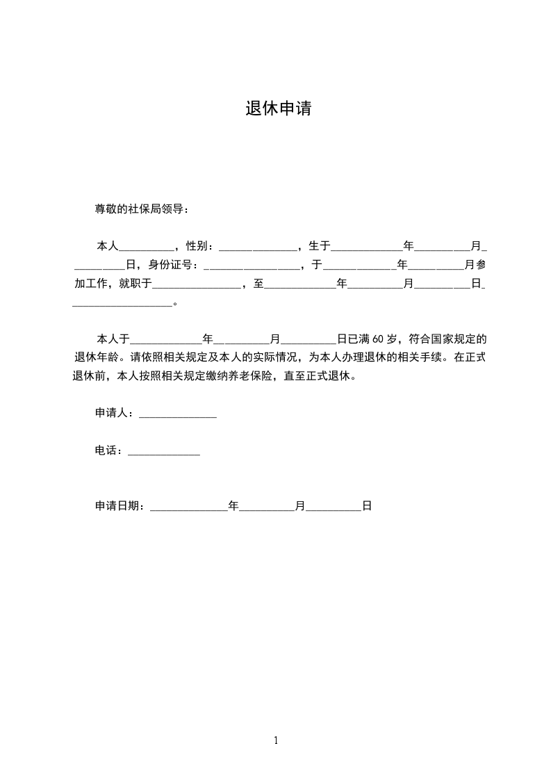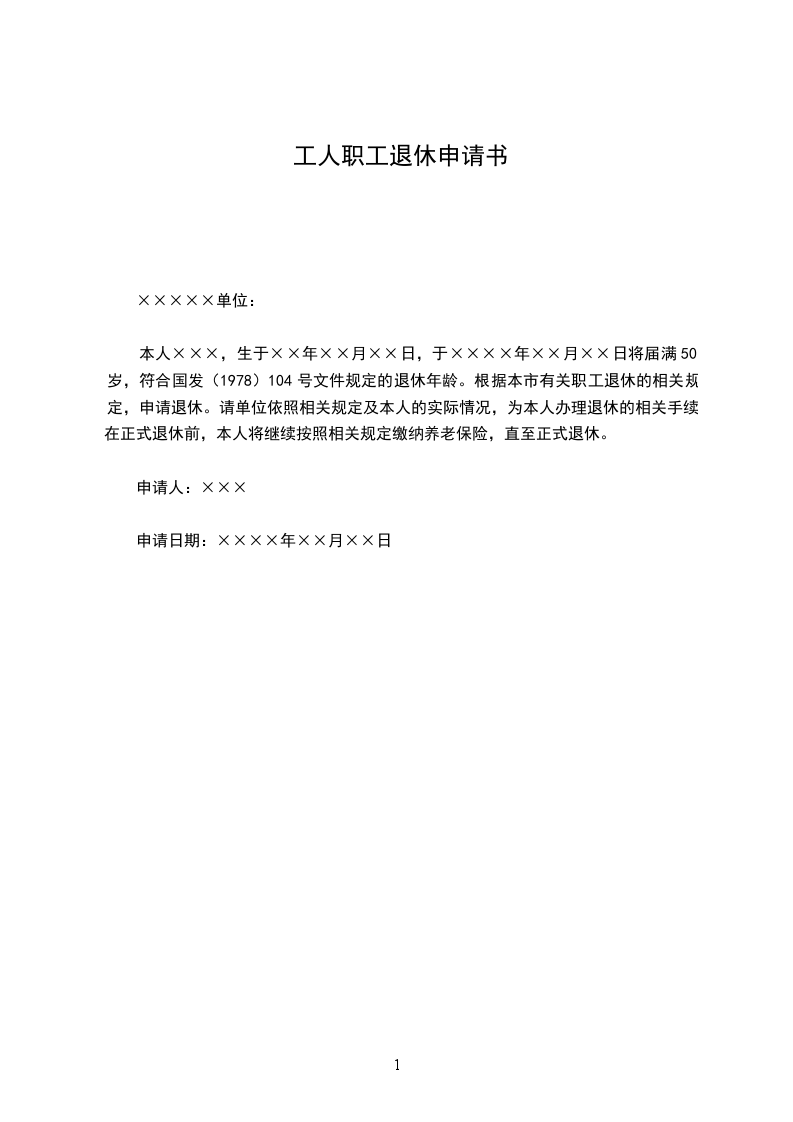 本人×××,生于××年××月××日,于××××年××月××日将届满50岁,符合国发(1978)104号文件规定的退休年龄。根据本市有关职工退休的相关规定,申请退休。请单位依照相关规定及本人的实际情况,为本人办理退休的相关手续。在正式退休前,本人将继续按照相关规定缴纳养老保险,直至正式退休。
