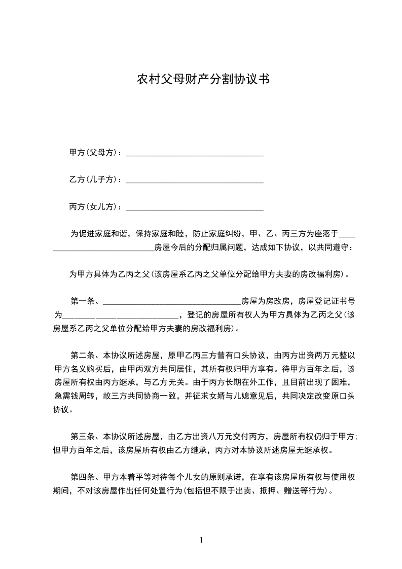 第一条、__________________________________房屋为房改房,房屋登记证书号为____________________________,登记的房屋所有权人为甲方具体为乙丙之父(该房屋系乙丙之父单位分配给甲方夫妻的房改福利房)。