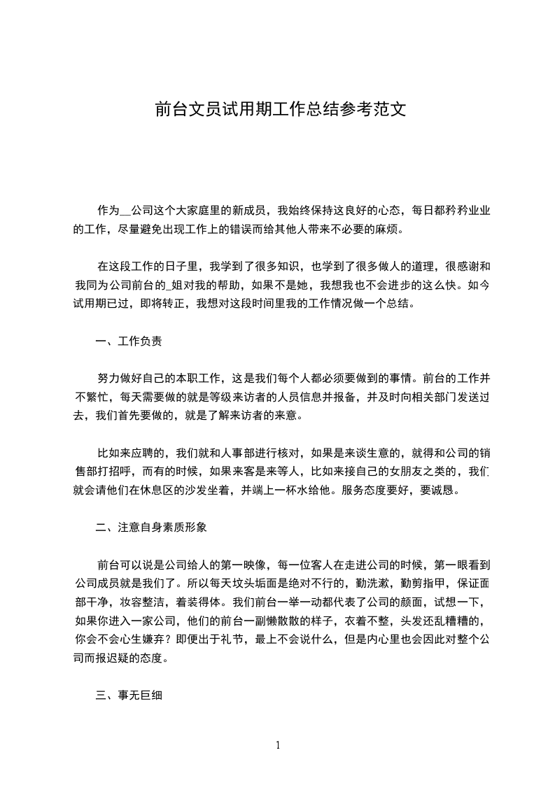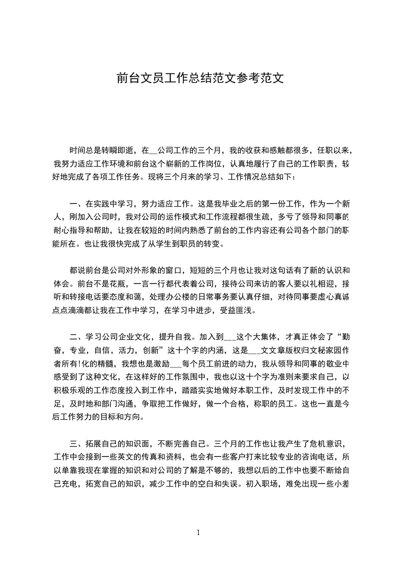 时间总是转瞬即逝,在__公司工作的三个月,我的收获和感触都很多,任职以来,我努力适应工作环境和前台这个崭新的工作岗位,认真地履行了自己的工作职责,较好地完成了各项工作任务。现将三个月来的学习、工作情况总结如下: