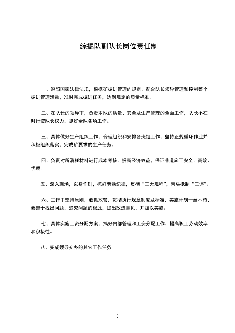 一、遵照国家法律法规,根据矿掘进管理的规定,配合队长领导管理和控制整个掘进管理活动,准时完成掘进任务,达到规定的质量标准。