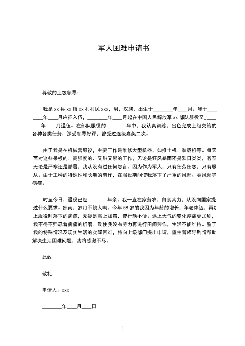 时至今日,退役已经________年余。我一直在家务农,自食其力,从没向国家提过什么要求。然而,岁月不饶人啊。今年58岁的我因为年龄的增长,年老体迈,再加上服役时落下的病症,无疑是雪上加霜,使行动不便。遇上天气的变化疼痛更加剧,我不得不强忍着病痛的折磨。致使我没有劳力再进行田间劳作,生活不能维持。鉴于我的特殊情况及现实生活的实际困难,特向上级部门提出申请,望主管领导酌情帮助解决生活困难问题,我将感激不尽。