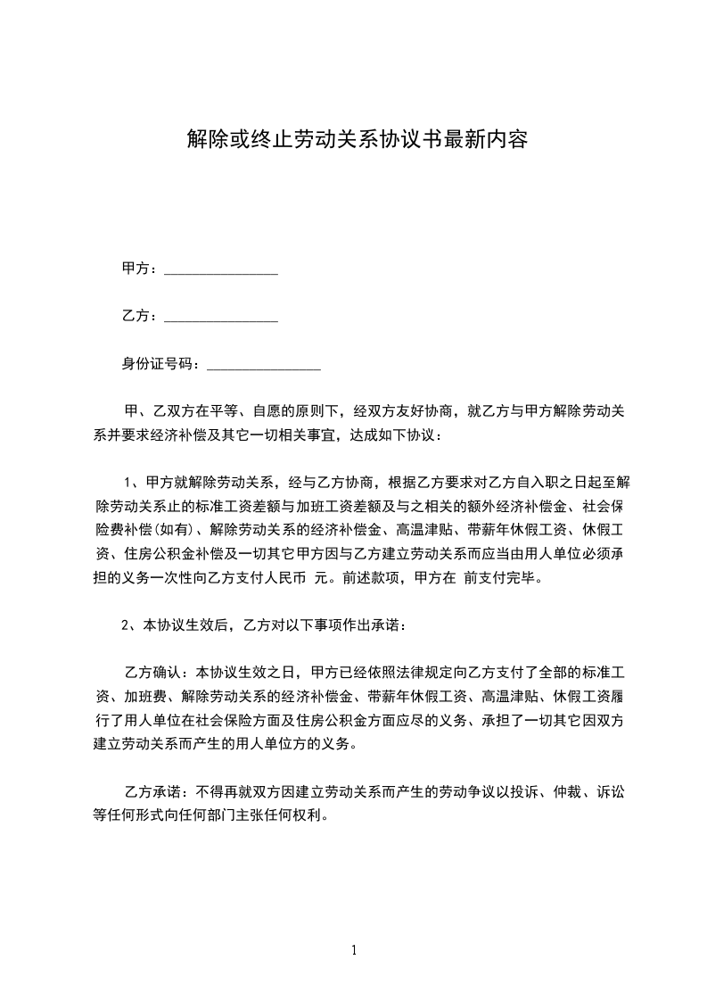 甲、乙双方在平等、自愿的原则下,经双方友好协商,就乙方与甲方解除劳动关系并要求经济补偿及其它一切相关事宜,达成如下协议: