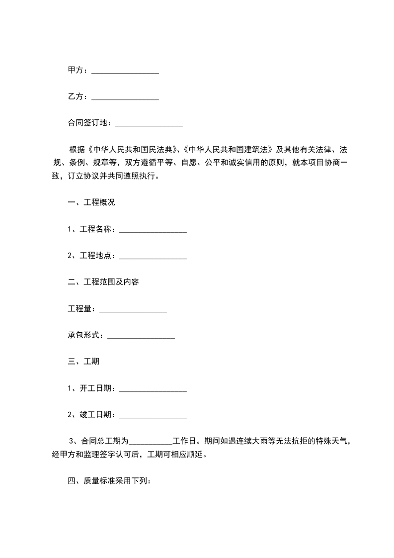 3、合同总工期为___________工作日。期间如遇连续大雨等无法抗拒的特殊天气,经甲方和监理签字认可后,工期可相应顺延。