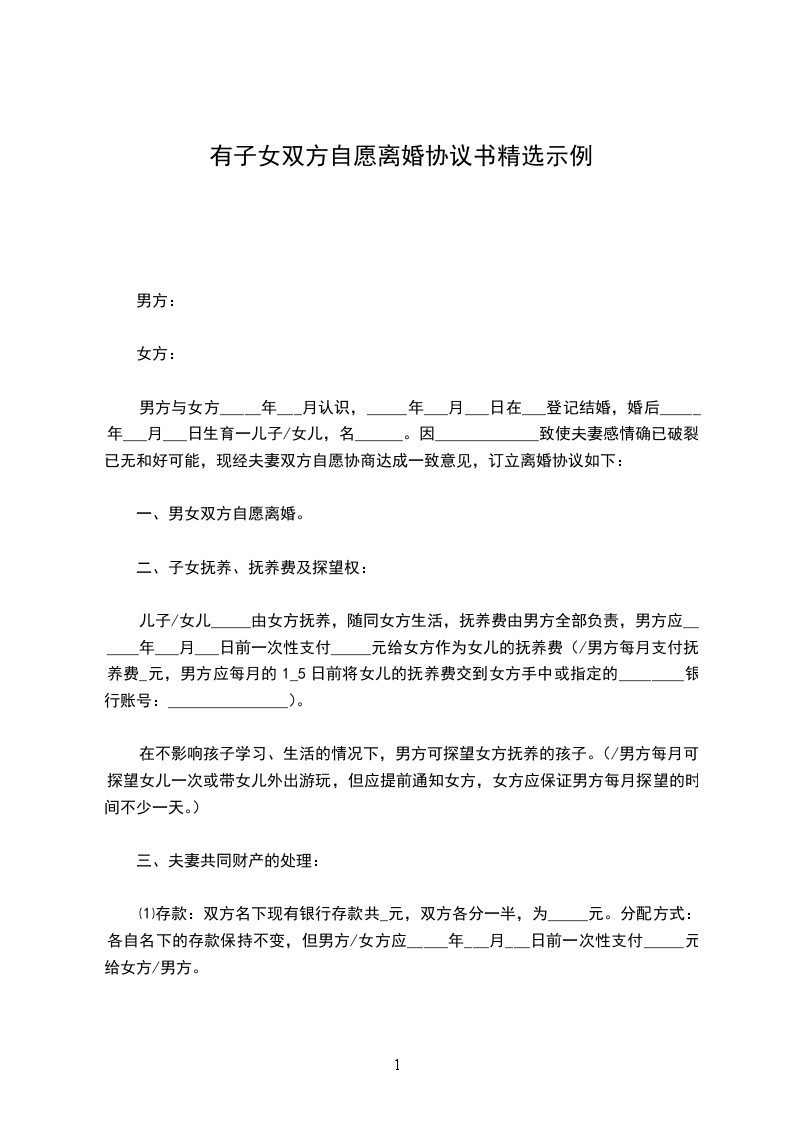 男方与女方_____年___月认识,_____年___月___日在___登记结婚,婚后_____年___月___日生育一儿子/女儿,名______。因_____________致使夫妻感情确已破裂,已无和好可能,现经夫妻双方自愿协商达成一致意见,订立离婚协议如下: