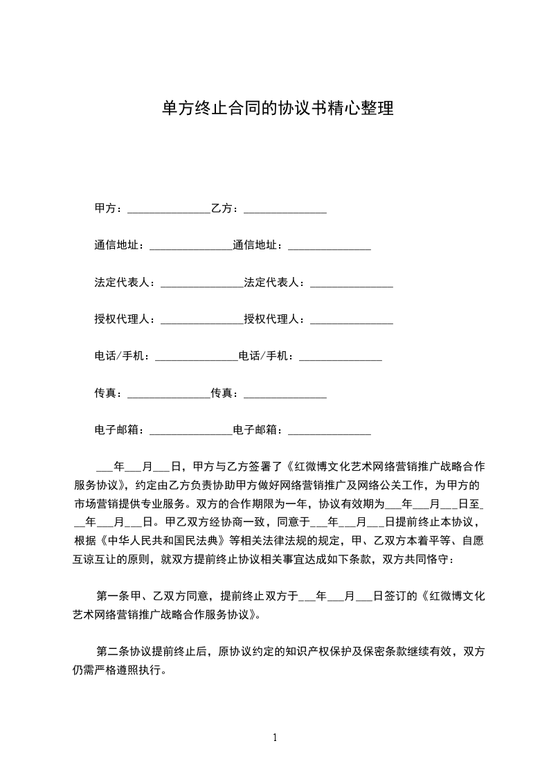 第一条甲、乙双方同意,提前终止双方于___年___月___日签订的《红微博文化艺术网络营销推广战略合作服务协议》。