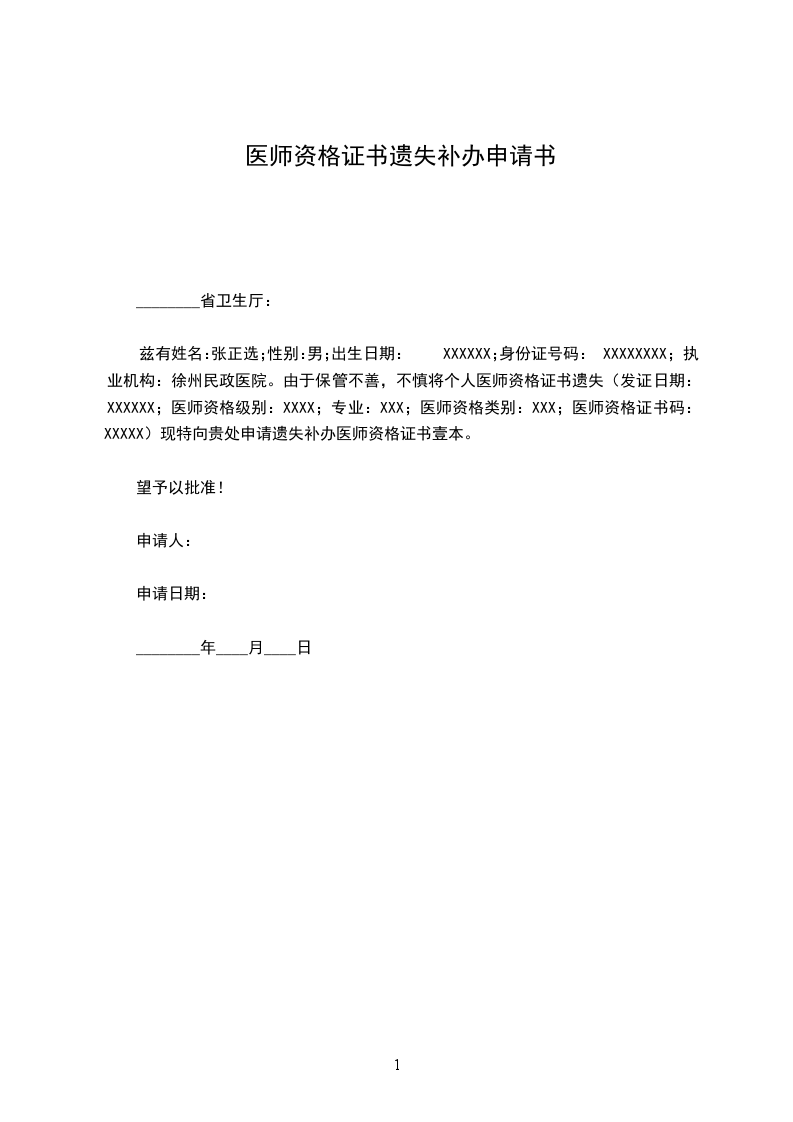 兹有姓名:张正选;性别:男;出生日期:XXXXXX;身份证号码:XXXXXXXX;执业机构:徐州民政医院。由于保管不善,不慎将个人医师资格证书遗失(发证日期:XXXXXX;医师资格级别:XXXX;专业:XXX;医师资格类别:XXX;医师资格证书码:XXXXX)现特向贵处申请遗失补办医师资格证书壹本。
