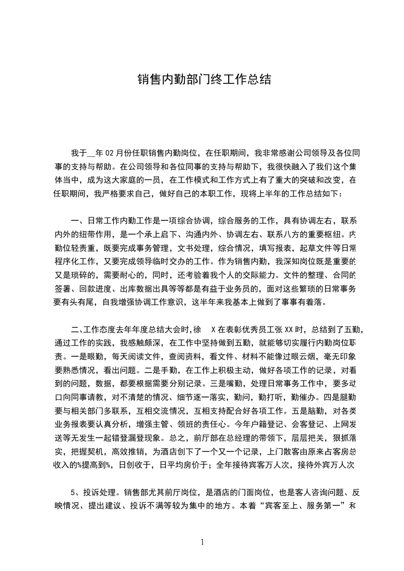 作为公司的销售内勤,我深知岗位的重工性,也能增强我个人的交际能力。销售部内勤是一个承上启下、沟通内外、协调左右、联系八方的重要枢纽,把握市场购机用户资料的收集,为销售部业务人员做好保障。在一些文件的整理、分期买卖合同的签署、用户逾期欠款额、销售数量等等都是一些有益的决策文件,面对这些繁琐的日常事务,要有头有尾,自我增强协调工作意识,这些基本上做到了事事有着落。