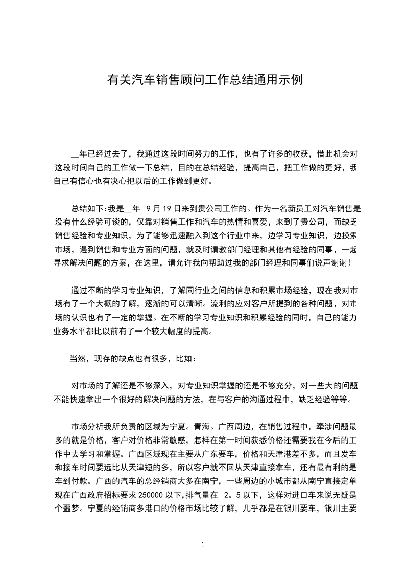总结如下:我是__年9月19日来到贵公司工作的。作为一名新员工对汽车销售是没有什么经验可谈的,仅靠对销售工作和汽车的热情和喜爱,来到了贵公司,而缺乏销售经验和专业知识,为了能够迅速融入到这个行业中来,边学习专业知识,边摸索市场,遇到销售和专业方面的问题,就及时请教部门经理和其他有经验的同事,一起寻求解决问题的方案,在这里,请允许我向帮助过我的部门经理和同事们说声谢谢!
