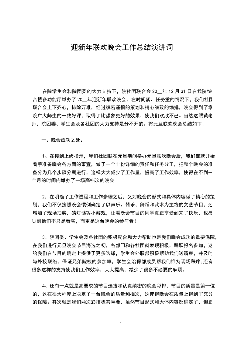在院学生会和院团委的大力支持下,院社团联合会20__年12月31日在我院综合楼多功能厅举办了20__年迎新年联欢晚会。在时间紧、任务重的情况下,我们社团联合会上下齐心,排除万难,经过缜密谨慎的策划和精心细致的编排,晚会得到了学院广大师生的一致好评,取得了比想象更好的效果,使我们欢欣不已。当然这跟黄老师,院团委、学生会及各社团的大力支持是分不开的。将元旦联欢晚会总结如下: