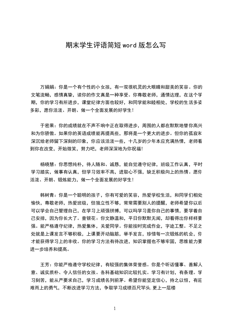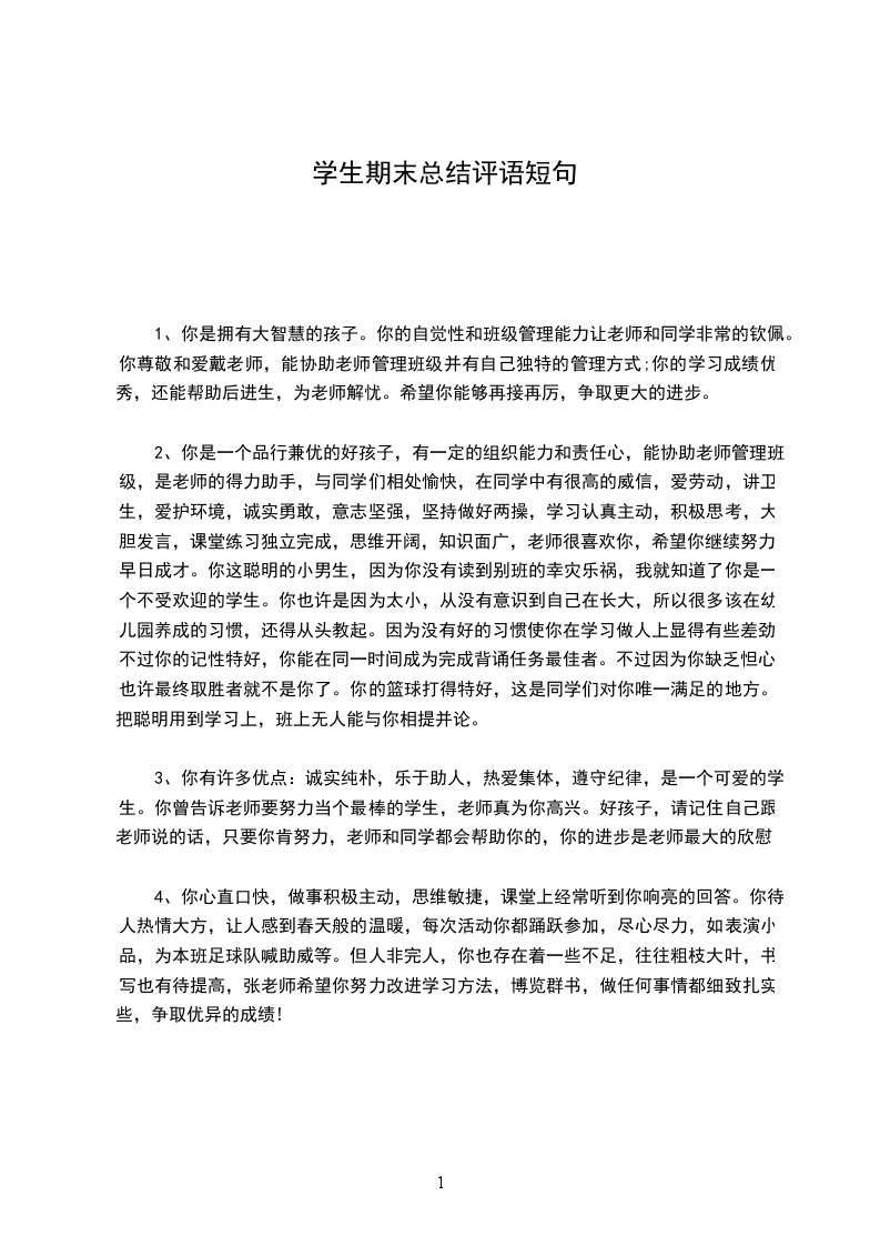 2、你是一个品行兼优的好孩子,有一定的组织能力和责任心,能协助老师管理班级,是老师的得力助手,与同学们相处愉快,在同学中有很高的威信,爱劳动,讲卫生,爱护环境,诚实勇敢,意志坚强,坚持做好两操,学习认真主动,积极思考,大胆发言,课堂练习独立完成,思维开阔,知识面广,老师很喜欢你,希望你继续努力,早日成才。你这聪明的小男生,因为你没有读到别班的幸灾乐祸,我就知道了你是一个不受欢迎的学生。你也许是因为太小,从没有意识到自己在长大,所以很多该在幼儿园养成的习惯,还得从头教起。因为没有好的习惯使你在学习做人上显得有些差劲。不过你的记性特好,你能在同一时间成为完成背诵任务最佳者。不过因为你缺乏怛心,也许最终取胜者就不是你了。你的篮球打得特好,这是同学们对你唯一满足的地方。把聪明用到学习上,班上无人能与你相提并论。